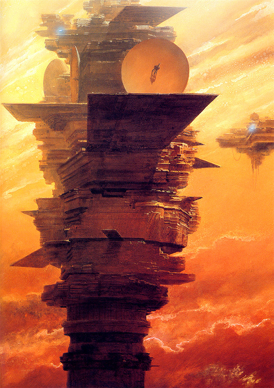 I was completely blown away by the atmosphere of this image: the palette, the scale, and the combination of primitive monolithic architecture with sinister technology all tickled my imagination.